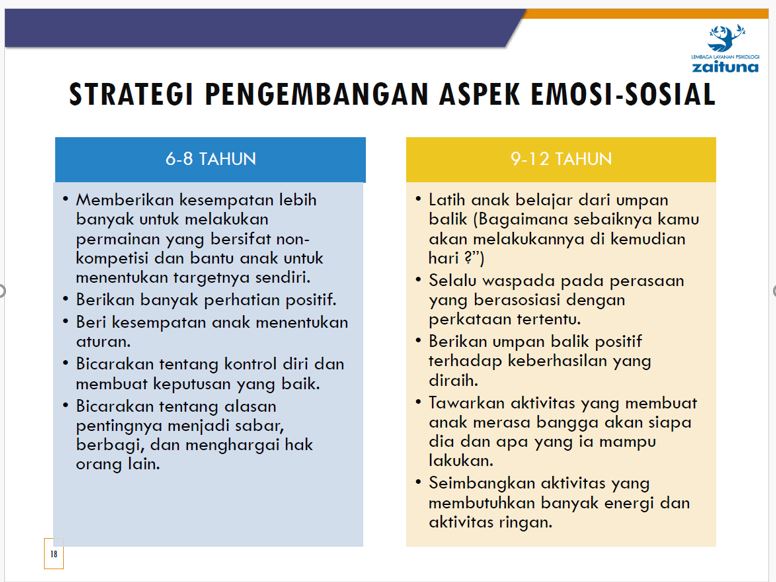 Adapun strategi pengembangan aspek emosi-sosial pada anak SD dapat dilakukan sebagaimana berikut.